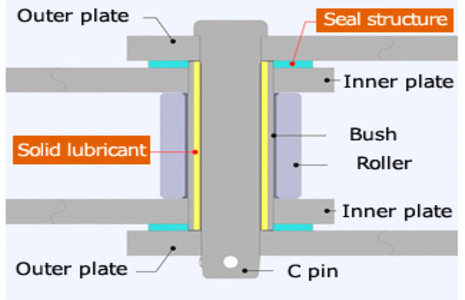 Al fijar un lubricante sólido entre el pasador y el casquillo, y al colocar juntas tóricas entre los eslabones, se evita que el material transportado entre en el mecanismo del eslabón.