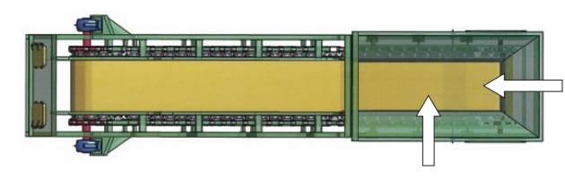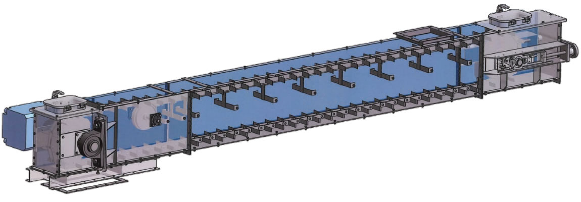 El movimiento de la cadena que discurre por el interior de la carcasa permite transportar la materia prima de forma fluida, como un flujo de agua, lo que la hace adecuada para su uso en configuraciones horizontales o con una ligera pendiente.