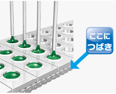 Mediante el uso de casquillos especiales de plástico de ingeniería* en la sección de cojinetes, se logra sin lubricación. Esto se traduce en una larga vida útil y una menor elongación inicial de la cadena, lo que lo hace ideal para máquinas de llenado y envasado.