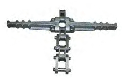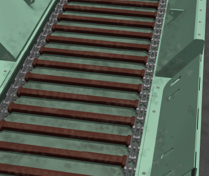 Para este mecanismo de transporte, Tsubakimoto Chain proporciona cadenas transportadoras con rompedores de alimentación (con bujes de acero) y barras de paletas de eficacia probada.