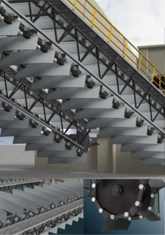 La cadena de la cinta transportadora recuperadora, equipada con paletas de excavación, se apoya en rieles y estructuras de soporte instaladas por encima o transversalmente a las pilas de material a recuperar, transportando las materias primas al proceso de la planta.