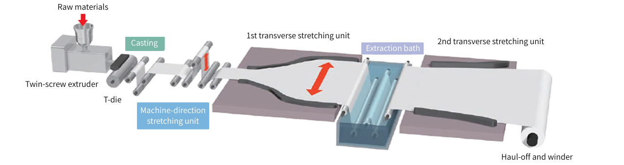 La materia prima extruida por la boquilla en forma de T se enfría y se estira.