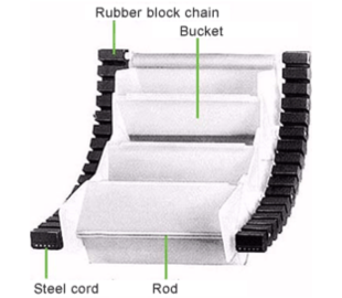 Esta cinta transportadora tipo contenedor utiliza cadena de bloques y cangilones de estructura única. La parte delantera y trasera de cada cangilón se unen al siguiente mediante correas flexibles, eliminando así los huecos en las conexiones.