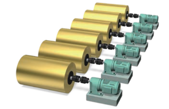 En configuraciones donde un solo motor acciona varios rodillos, es posible seleccionar componentes como reductor de tornillo sin fin, Caja de cambios de inglete, acoplamientos de disco y correas síncronas en un solo paquete para que se ajusten al diseño.