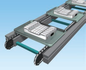 Para el transporte entre procesos de baterías rectangulares y laminadas, que a menudo se transportan en palés, se utilizan con frecuencia cadenas de flujo libre con capacidad de acumulación.