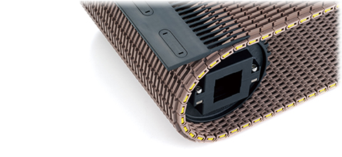 Esta cadena de plástico se combina con placas de dientes de peine como las que se encuentran en las secciones de transferencia de escaleras mecánicas, eliminando espacios en las secciones de transferencia.