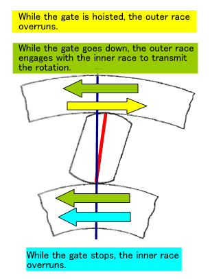 Al soltar el freno, la compuerta comienza a descender por su propio peso. En ese momento, el embrague de levas se acopla automáticamente, accionando el freno hidráulico o el freno de ventilador. Esta operación limita la velocidad de descenso de la compuerta a un nivel determinado. Asimismo, cuando la compuerta llega al fondo del río, el eje reductor se detiene, pero el freno hidráulico o el freno de ventilador continúa girando por inercia. En ese momento, el embrague de levas se pone en ralentí automáticamente para evitar daños en el eje.