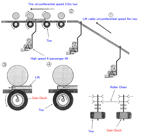 Este es un ejemplo de un telesilla multitrayecto que se utiliza para ajustar la diferencia de velocidad entre las velocidades alta y baja en los puntos de embarque y desembarque.