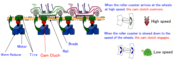 El embrague de levas girará cuando la montaña rusa se acerque a la rueda a alta velocidad, lo que provocará que la montaña rusa...