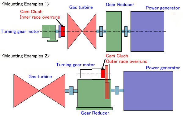 En el ejemplo de instalación 1, el pista interior interior del embrague de leva gira libremente a alta velocidad cuando la turbina está funcionando, pero la leva se levanta (flota) y los pista exterior pista interior y exterior ya no están en contacto.