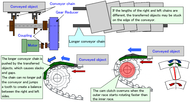 Si la cadena transportadora tiende a doblarse debido a la fuerza de empuje de las mercancías transportadas, el pista exterior exterior del embrague de leva se doblará más que pista interior.