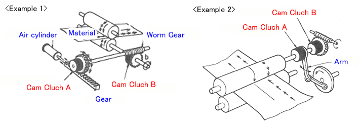El embrague de leva A convierte el movimiento alternativo de la cremallera, generado por el cilindro neumático, en movimiento intermitente, e indexa (alimenta intermitentemente) el rodillo mediante un tornillo sin fin. En este caso, el embrague de leva B está acoplado. Para accionar el rodillo de forma continua sin indexación, gire el eje B en el sentido de A para que el rodillo gire continuamente. En este caso, el embrague de leva B gira en vacío y está desconectado del embrague de leva A.