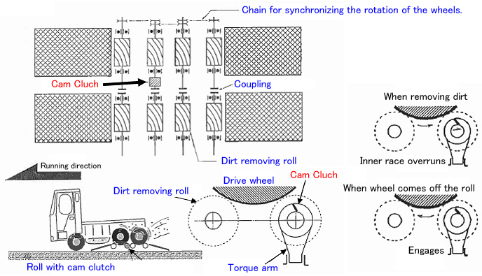 Un ejemplo de su uso es un dispositivo que hace girar los neumáticos de un coche sobre un rodillo para eliminar el barro adherido a ellos.