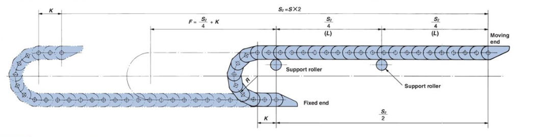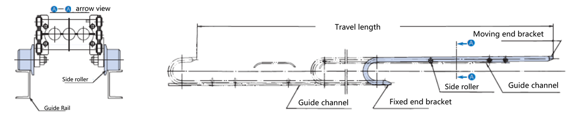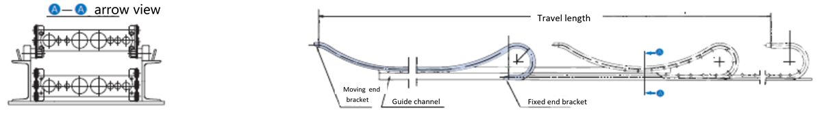 | Características | Se trata de un método de instalación especial utilizado para carreras largas que superan gráfico de carga admisible cuando se instalan dos rodillos de soporte. En principio, los accesorios de extremo móvil están diseñados especialmente y difieren del estándar. La altura de instalación del extremo móvil también difiere del estándar. |