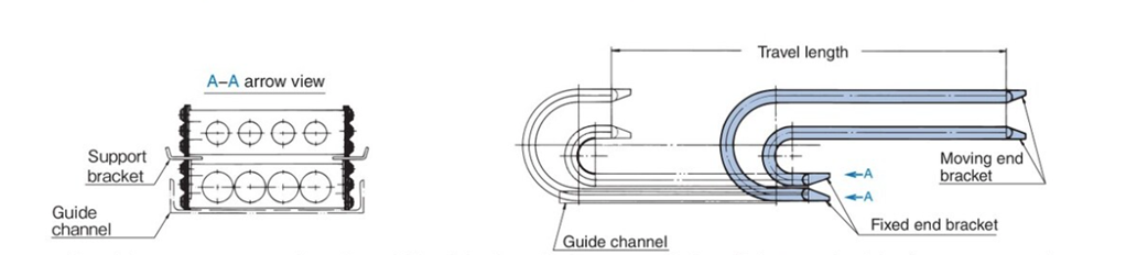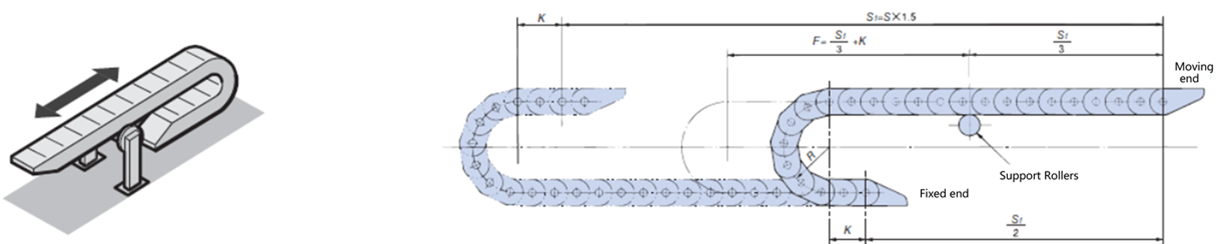 | Características | Portacables (CABLEVEYOR) se utiliza horizontalmente. Esto se aplica cuando la superficie de montaje del soporte es horizontal, longitud de recorrido es larga o hay poco espacio en la dirección vertical. |