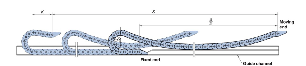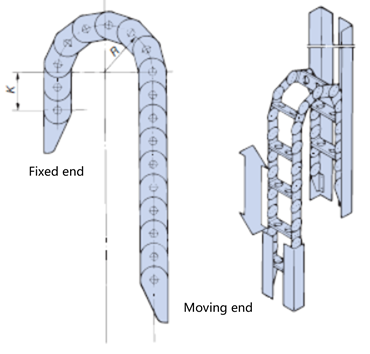 | Método guía | Se requieren rieles escalonados para guiar el Portacables (CABLEVEYOR) flexible durante su desplazamiento. La separación izquierda y derecha entre Portacables (CABLEVEYOR) y canal guía debe ser menor que en una instalación estándar. |