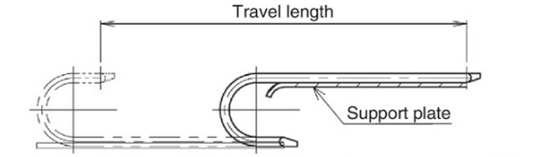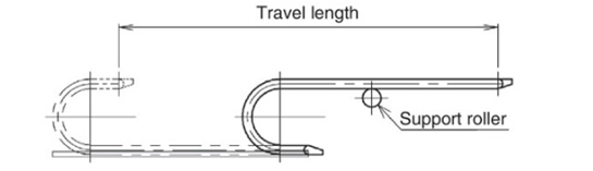 Nota: Al agregar rodillos o placas de apoyo cuando la deflexión de la sección de tramo libre ha avanzado, la posición de instalación (altura) y, en el caso de las placas de apoyo, la forma (la parte donde la sección de tramo libre se mueve sobre el riel) deben establecerse teniendo en cuenta la cantidad de deflexión de la sección de tramo libre en ese momento.