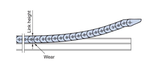 Con especificaciones disposición deslizante, la circunferencia interior del eslabón se desgastará con el tiempo. La recomendación para el reemplazo es cuando el desgaste de la altura del eslabón (o el desgaste de zapata de deslizamiento, si está equipada con zapata de deslizamiento) alcanza el valor permitido (tabla a la derecha). Para los modelos TKP58H39 con zapata de deslizamiento, TKP68H46 con zapata de deslizamiento, TKP91 (H56, H80), TKC91 (H56, H80), TKMK y TKMT, solo se puede reemplazar zapata de deslizamiento. Para obtener información sobre la prolongación de la vida útil de zapata de deslizamiento, consulte disposición deslizante.