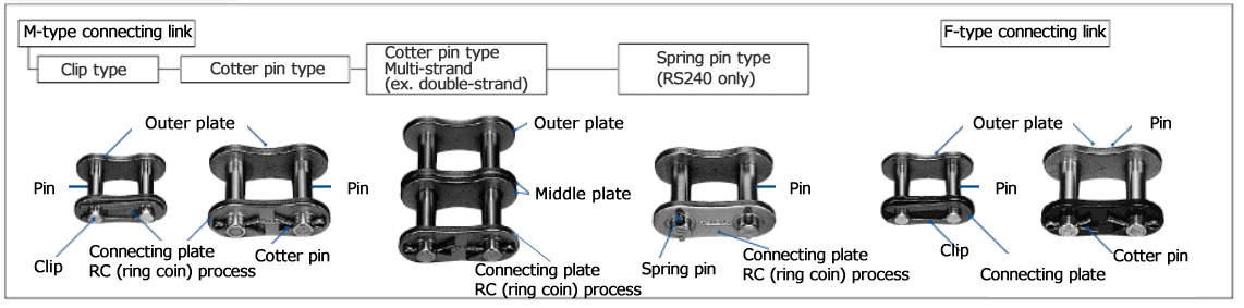 El eslabón exterior tiene dos pasadores ajuste a presión en dos placas exteriores. En el caso de múltiples hebras, se añade una placa intermedia al eslabón exterior. La placa intermedia de Cadena de rodillos RS tiene ajuste deslizante (*1), mientras que la de Cadena Super tiene ajuste a presión (*2).