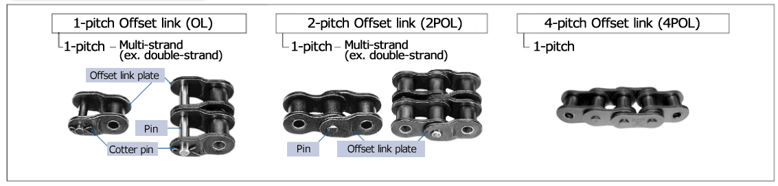 Las cadenas de rodillos suelen estar compuestas por muchos eslabones conectados y se utilizan sin fin o con final fijos. En ambos casos, se requieren eslabones de conexión (eslabones de conexión especiales para aplicaciones colgantes, etc.). Además, si una cadena de rodillos tiene un número impar de eslabones, se pueden utilizar Eslabón acodado, pero es mejor diseñarla con un número par de eslabones siempre que sea posible.