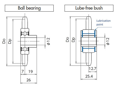 La sección de la rueda dentada tensora consta de una rueda dentada con un rodamiento incorporado (también está disponible como opción un casquillo sin aceite para el tipo TH), pernos de montaje y arandelas.