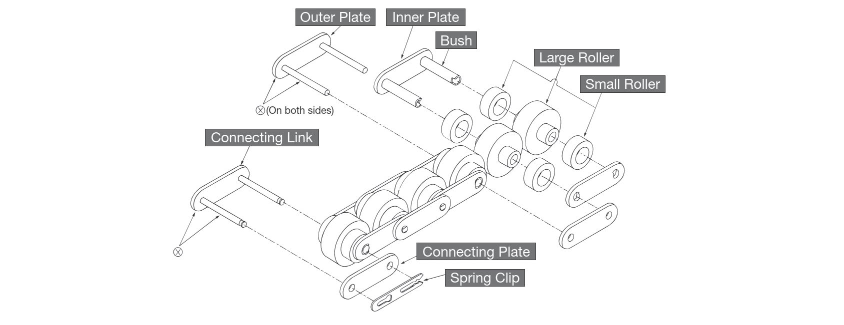 - Puede elegir la combinación de cuerpo de cadena (4 tipos) y rodillos (7 tipos) que mejor se adapte a su aplicación.