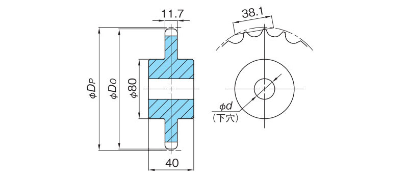 | Número de modelo | Número de dientes | número efectivo de dientes | Diámetro del círculo primitivo Dp mm | Diámetro exterior Do mm | Orificio del eje forma | orificio piloto mm | Masa Aproximada kg |