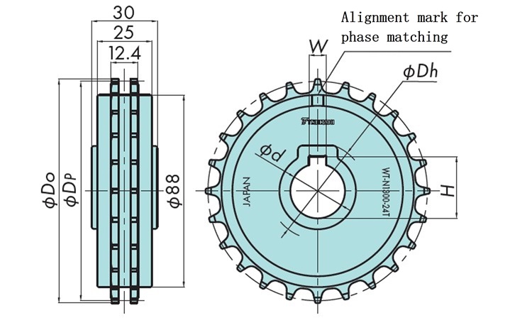 | Número de modelo | Número de dientes | Diámetro del círculo primitivo Dp mm | Diámetro exterior Do mm | Orificio del eje forma |