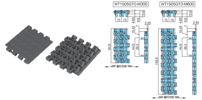 especificaciones principales cadena modular plástica tipo WT1505GTO-M