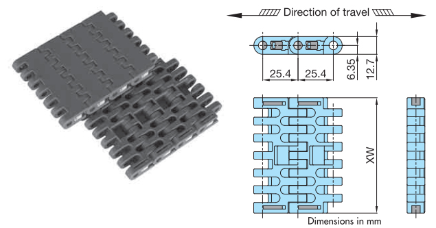 • - Paso de cadena=25,4 mm, ideal para el transporte de contenedores de tamaño medio.