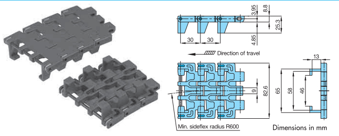especificaciones principales cadena modular plástica tipo WT3085-C
