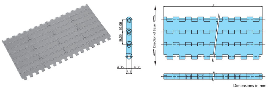 • ・幅広と幅狭のプラスチック製モジュールをレンガ状に組合せ、ワイドな搬送面を実現し大量搬送が可能です。