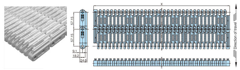 • ・幅広と幅狭のプラスチック製モジュールをレンガ状に組合せ、ワイドな搬送面を実現し大量搬送が可能です。