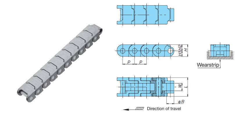 • Utiliza un paso menor que Cadena superior de plástico. El diámetro exterior del piñón es pequeño, lo que resulta eficaz para ahorrar espacio en los puntos de transferencia.