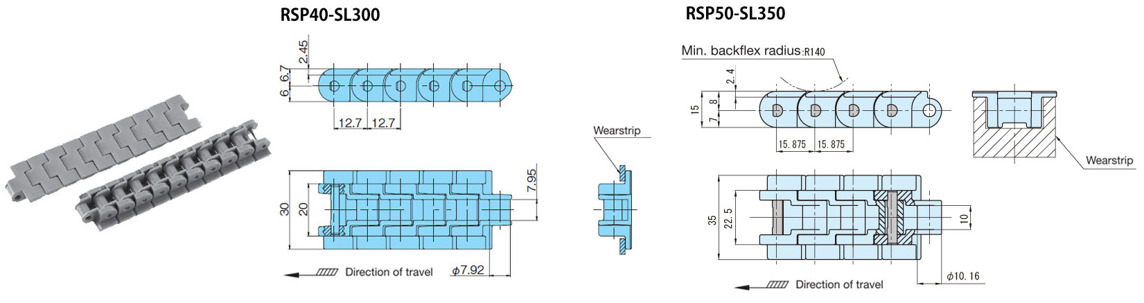 • ・プラトップチェーンより小さなピッチを採用。スプロケット外径を小さくでき、乗継部の省スペース化に有効です。