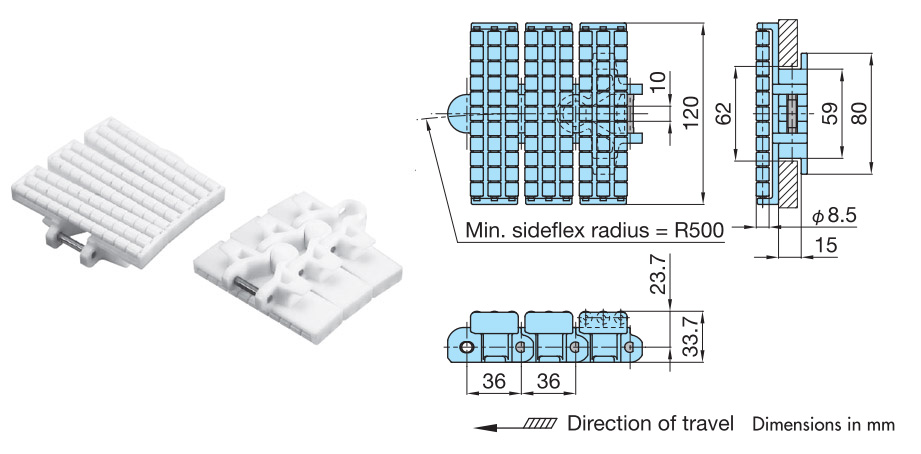 especificaciones principales de la cadena de acumulación curva Superior de plástico tipo TP-36UTW-LAP