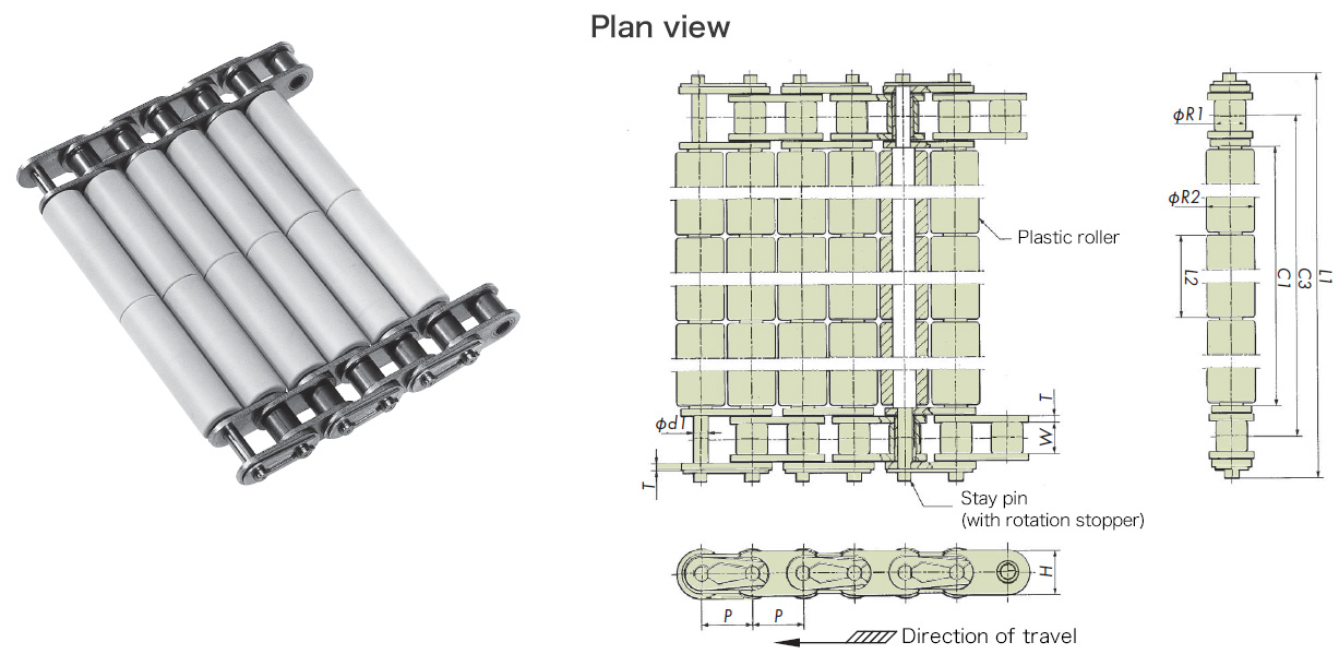 - -rodillo plástico están unidos a la línea de paso de la cadena, por lo que el espacio entre rodillo plástico no cambia incluso cuando la cadena está doblada.