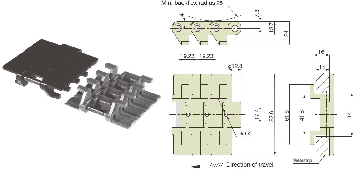 Paso de cadena mm Radio de curvatura hacia atrás mm