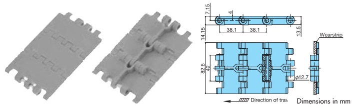 • ・くし歯状多ヒンジ構造により、トッププレートをラップさせており、搬送物の引掛りを防止します。ペットボトル等、不安定容器の搬送に最適です。