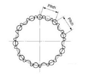 <Irregularidades de rotación> Las fluctuaciones en la velocidad de la cadena y las propiedades del piñón provocan una rotación desigual del piñón conducido. Además, también influyen errores de montaje excéntricos del piñón y errores de fabricación de la cadena y el piñón. Aumentar el número de dientes del piñón motriz (mayor diámetro) dará como resultado una transmisión más suave y menos irregularidades rotacionales. |